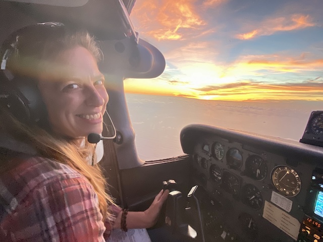 Amy Sanchez earned her Private Pilot Certificate in 2021, taking advantage of the unexpected gift of free time that came with the pandemic in the middle of an otherwise non-stop career as a professional musician. Amy’s love of wildlife photography and conservation had already lead her to Africa and Alaska, taking bush plane flights into the wilderness whenever possible. One particularly stunning float plane ride to Katmai National Park solidified her desire to become a pilot, and she pursued her first rating quickly, before her music career filled her schedule again.